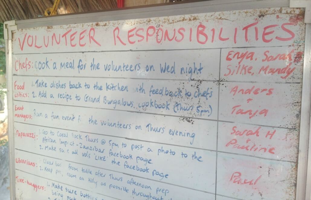מגורים: המתנדבים בתכנית מתגוררים בחדרים משותפים ל 2-3 אנשים בבית אשר נמצא מרחק הליכה מהים. כמו ברובה של זנזיבר, המקלחת אינה כוללת מים חמים לרחצה. בבית יש גם כילות נגד יתושים, מאווררים, שירותי אחזקה וכביסה. אוכל: במהלך ההתנדבות תקבלו שלוש ביום. ארוחת הבוקר בדרך כלל כוללת לחם, פירות, ביצים, תה וקפה. ארוחת הצהריים לעיתים יכולה להיות ארוזה או שתקבלו אותה במקום ההתנדבות. כביסה: שרותי כביסה cמחיר סימלי. אינטרנט: אין חיבור לאינטרנט במגורי המתנדבים. מי שמגיע עם מכשיר נייד, יכול להשתמש באינטרנט אל-חוטי באחד מהמלונות שעל החוף, מרחק כ-10 דקות הליכה מהמגורים.